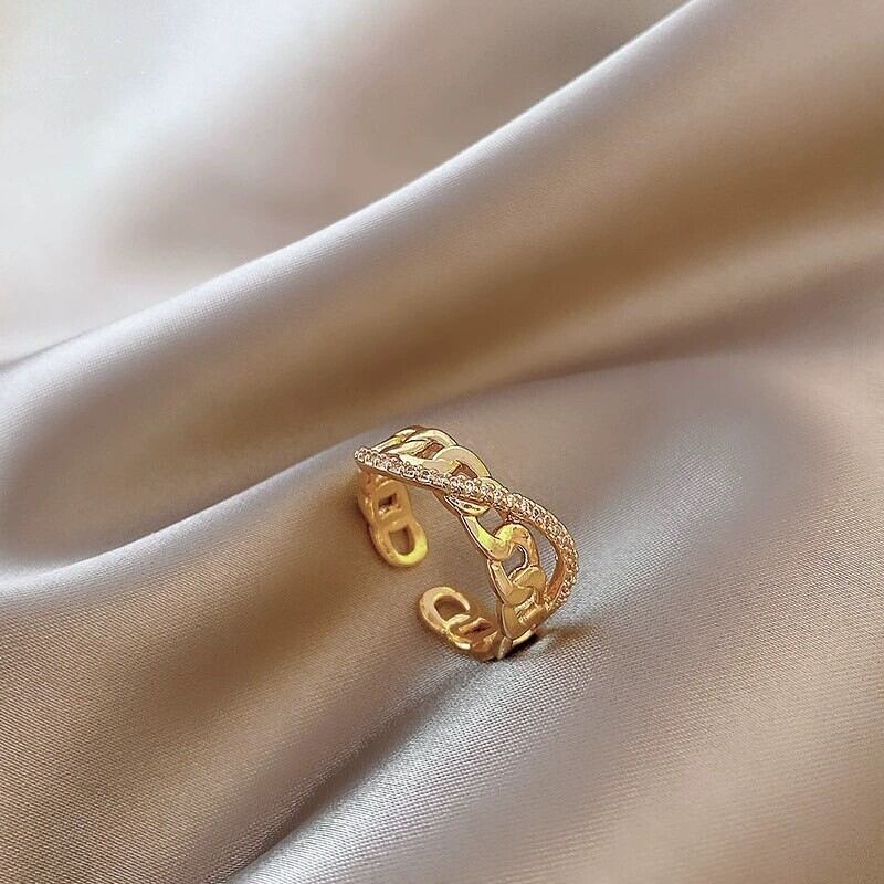 ゴールドとキラキラと輝くチェーンモチーフがエレガントな印象のリング。