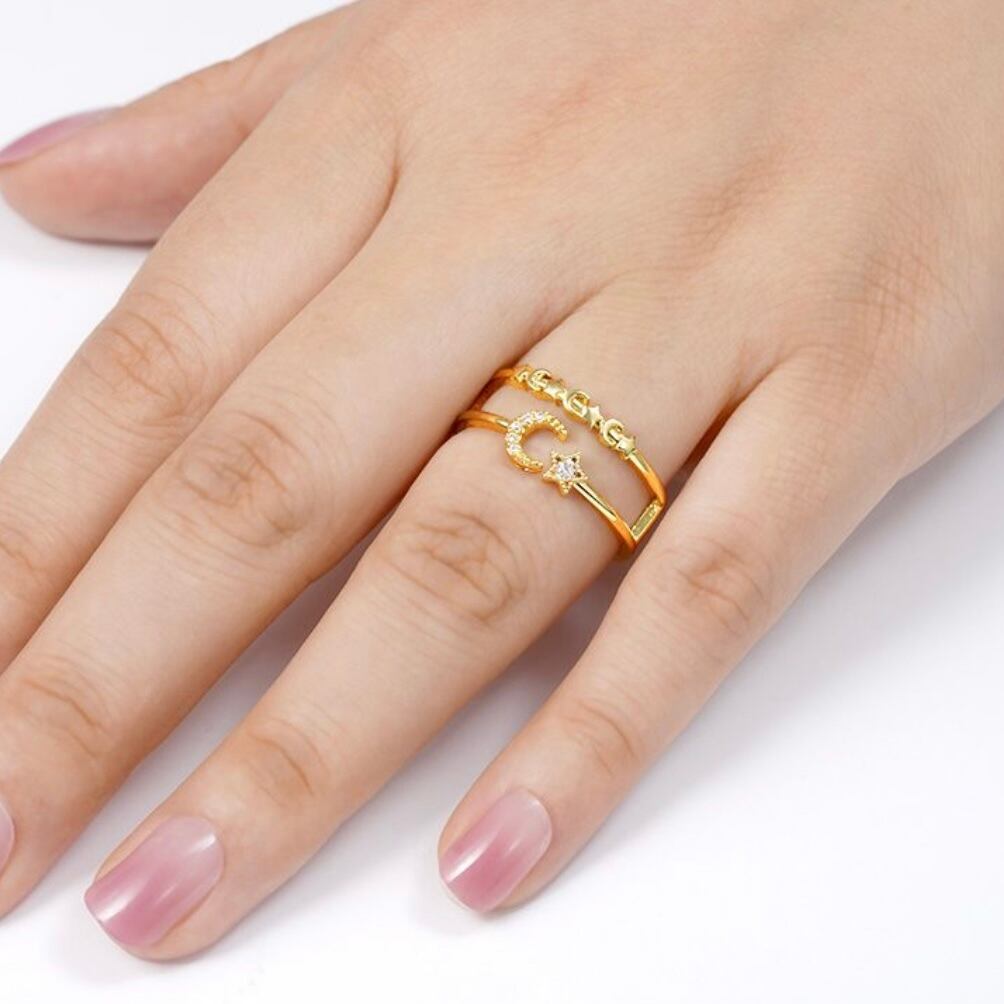 星空をイメージさせるリング。指先に輝く星と月のデザインが、シンプルながらも個性的なアクセサリーとしておすすめです。