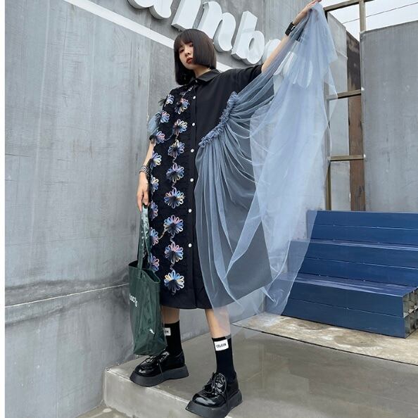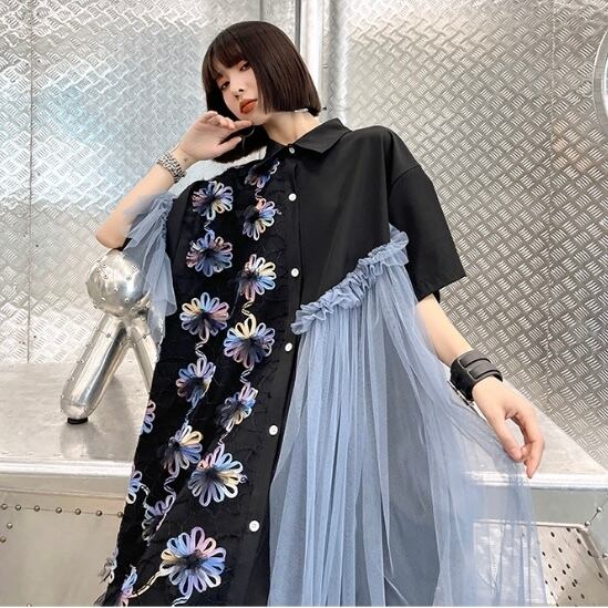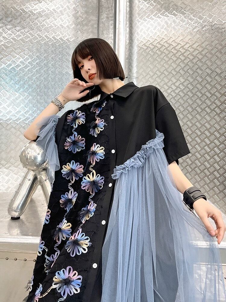 繊細な花柄が引き立つチュール付いたのワンピース。華やかなフリルが女性らしさを引き立て、パーティーやイベントで一際輝かせてくれます。前開きデザインなので、ジレとしてお使い頂く事もできますので幅広い用途でお使い頂けます。