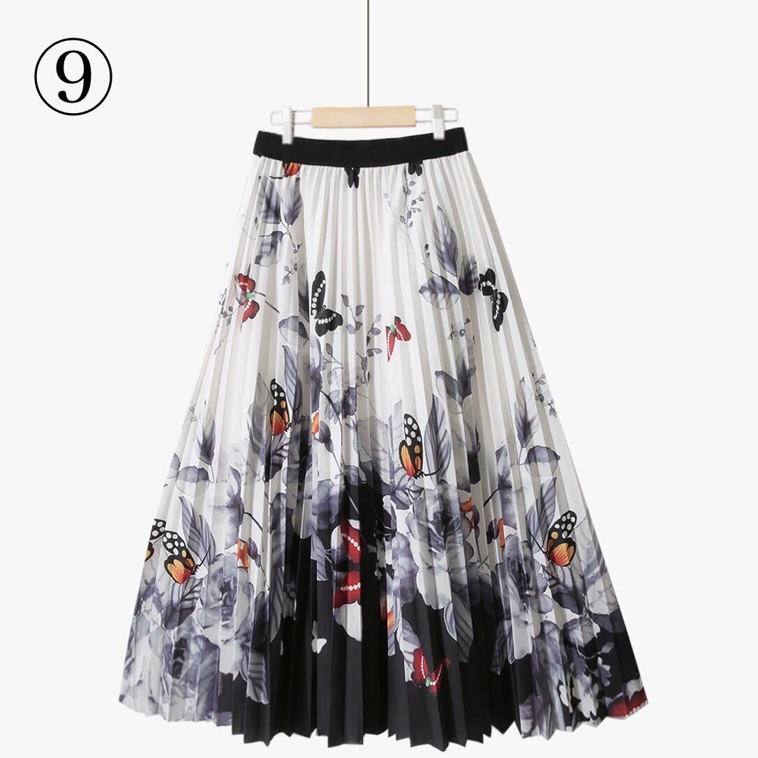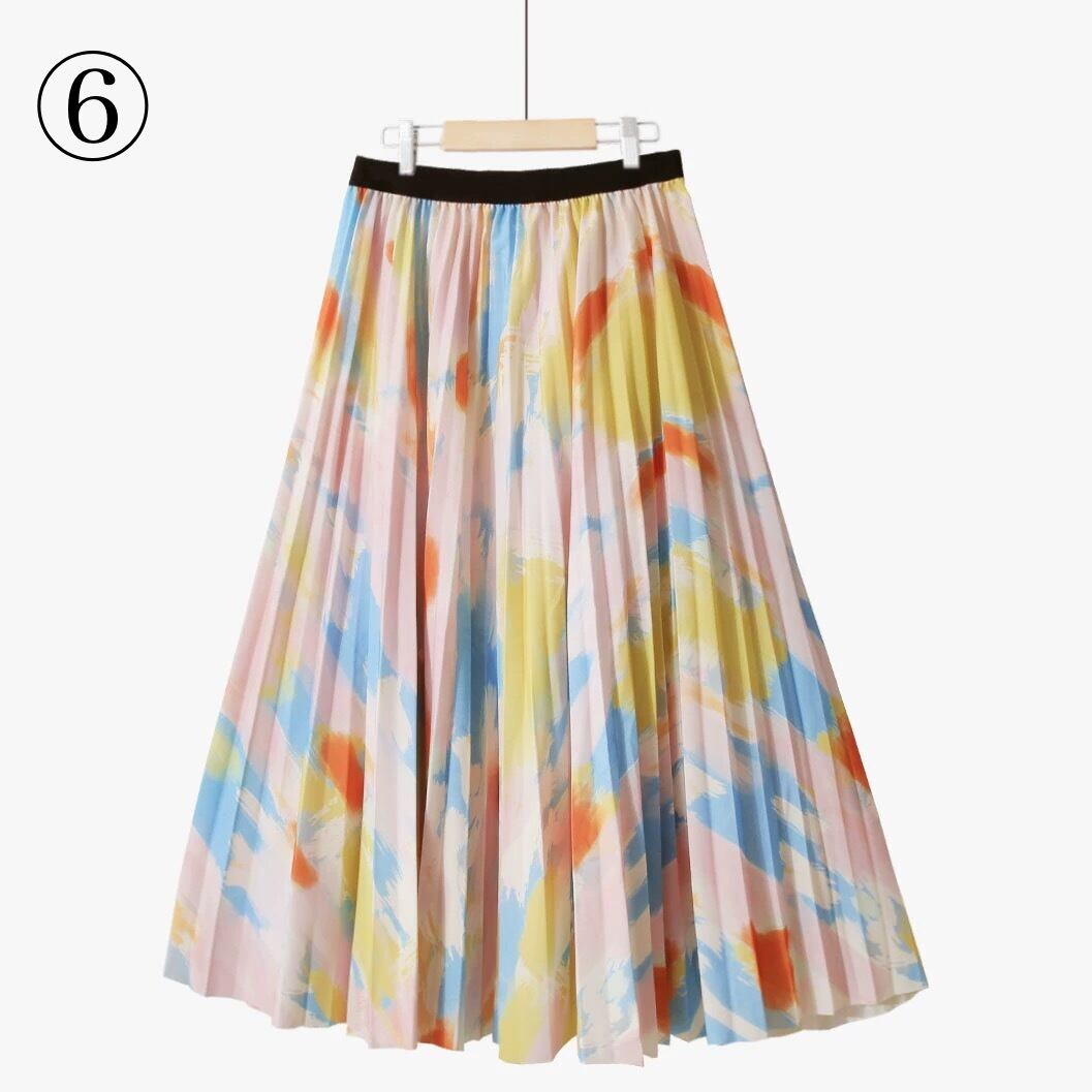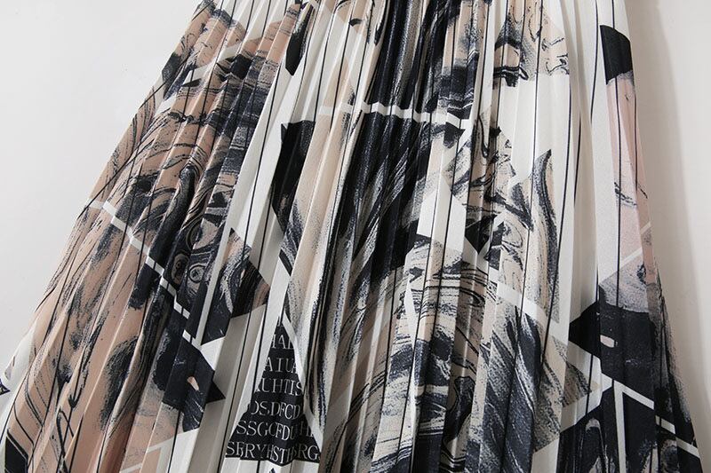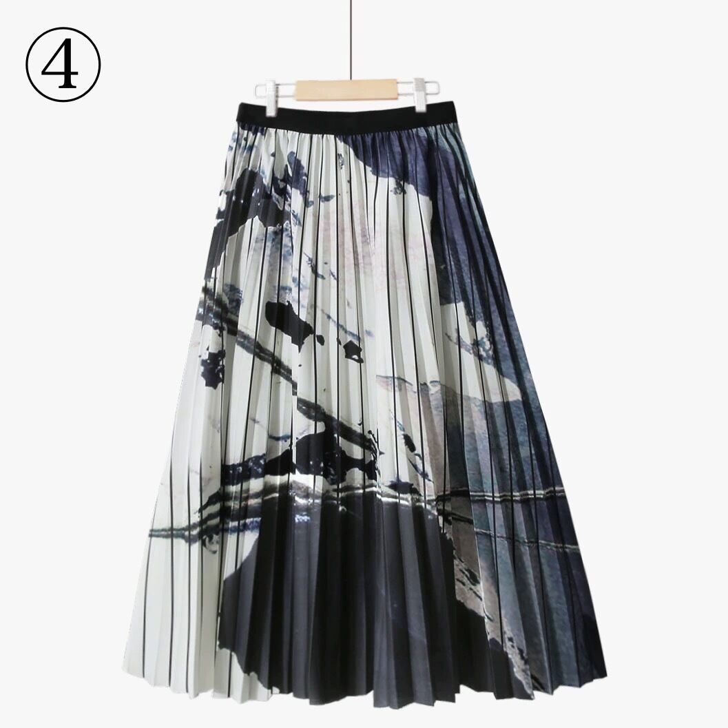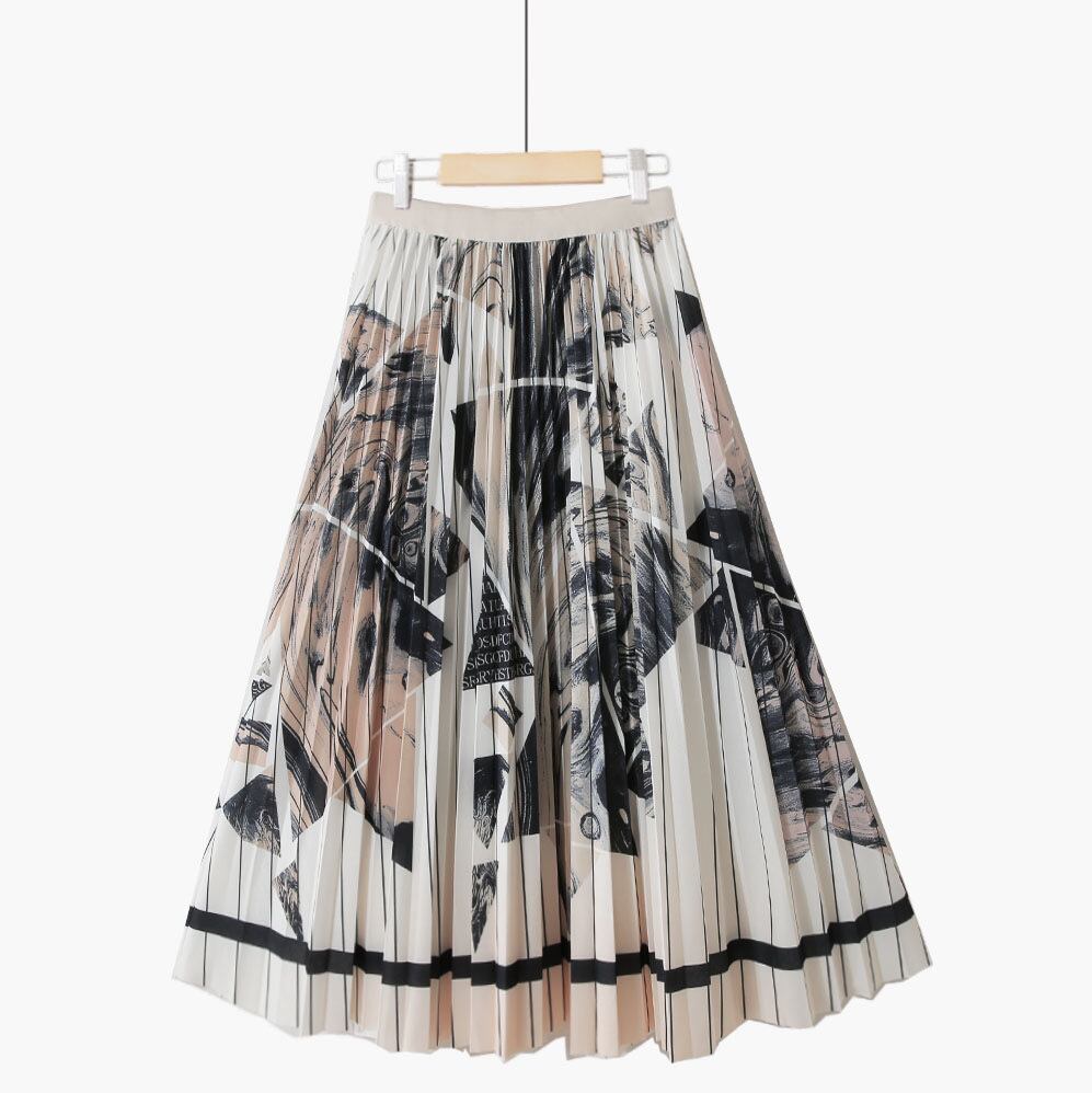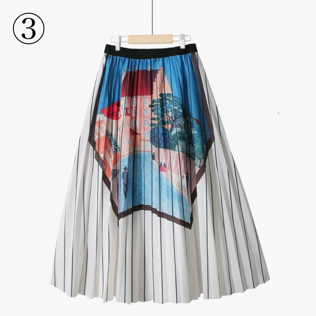上品で落ち着いた形のプリーツスカートと個性的なアートプリントがマッチしたスカート。