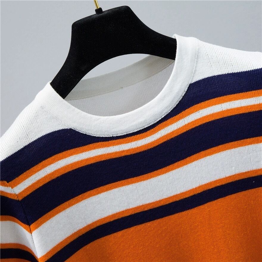 華やかでポップなオレンジとネイビーのボーダー柄が目を引き、周囲と差をつけること間違いなしのトップスです。