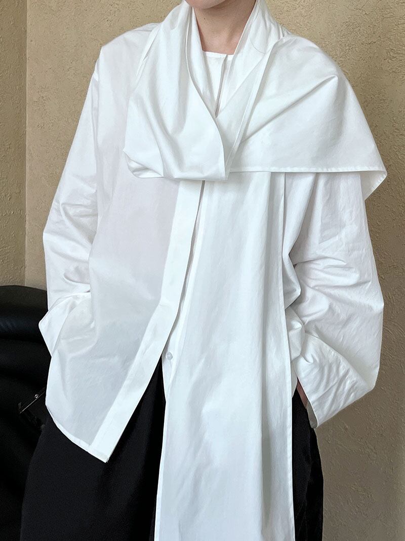 シンプルながらもモードな雰囲気を醸し出すホワイトブラウス。上質なコットン素材を使用し、ふんわりとした柔らかなシルエットが特徴です。
