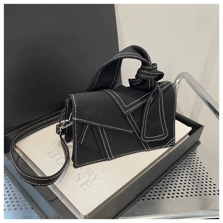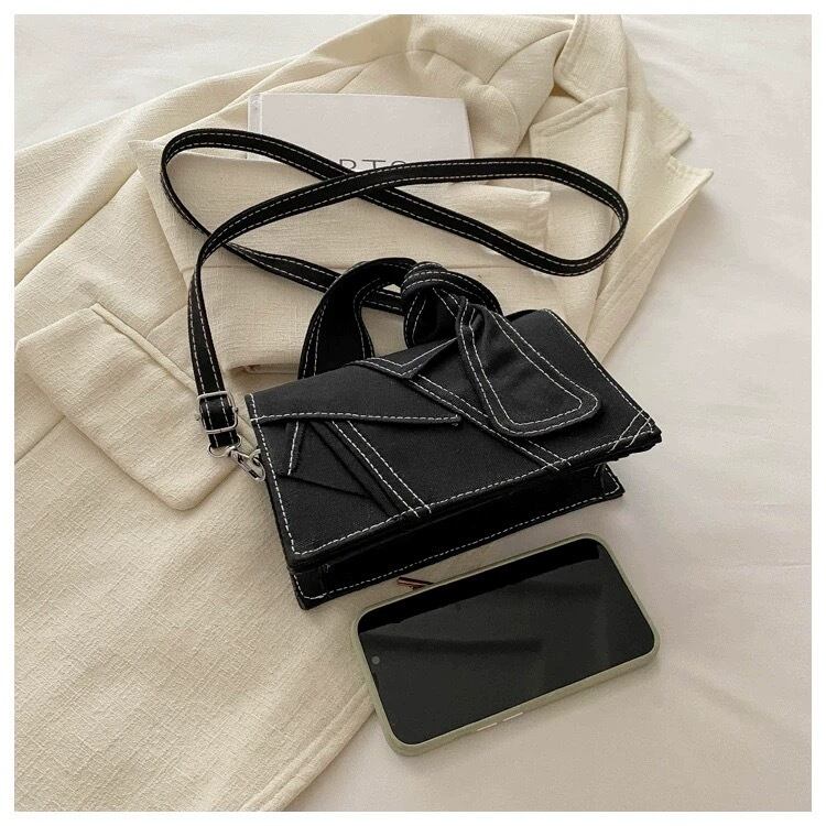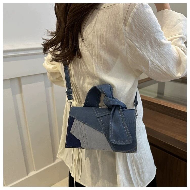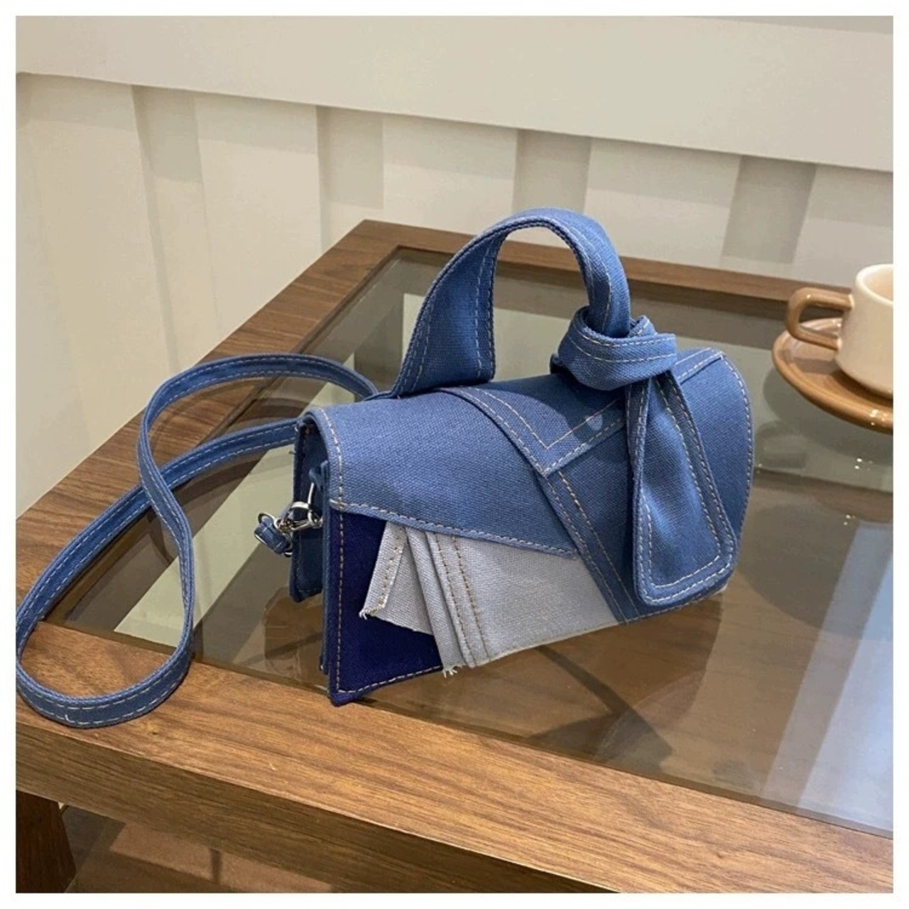 このデニムを使用したショルダーバッグは、スタイリッシュで独特なデザインが特徴です。フロントのリボンディテールとコントラストステッチが、バッグ全体にモダンなエレガンスを与えています。