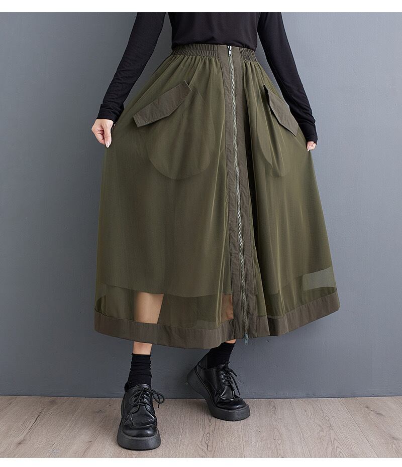 トレンドのシースルー素材を取り入れた、独特なデザインのジップ付きフレアスカート。
