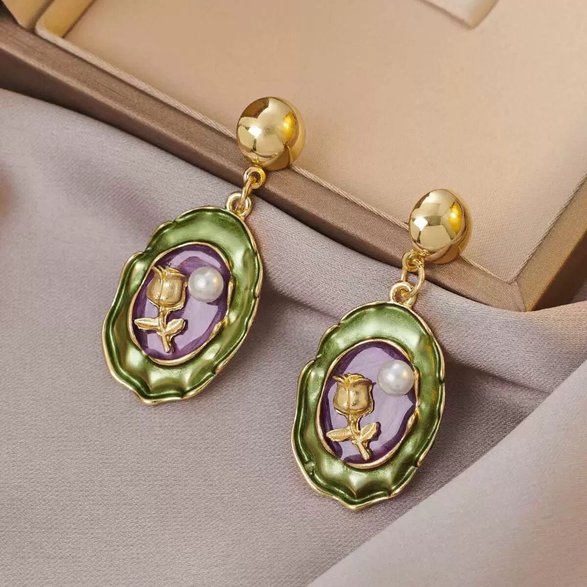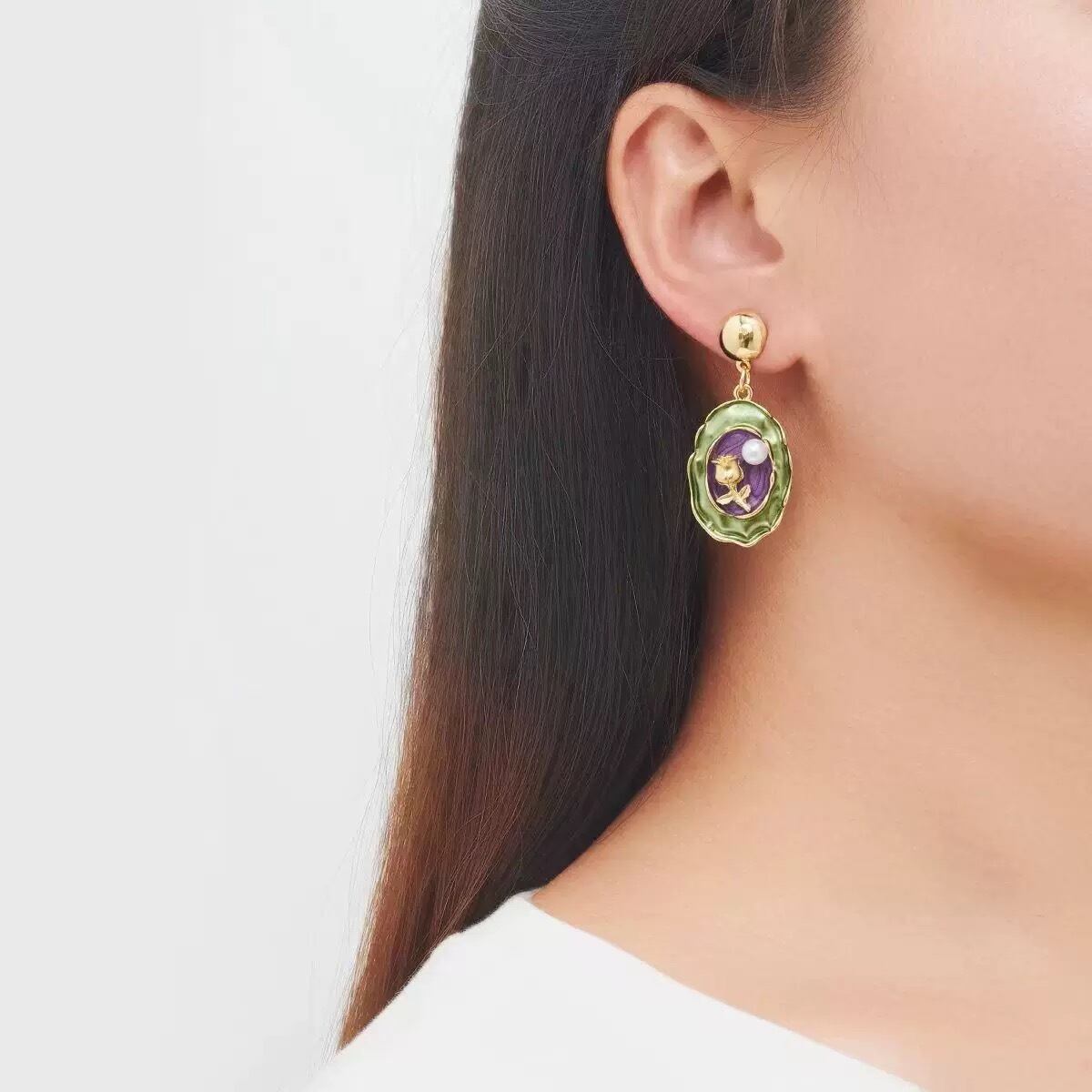ゴールドフレームに包まれたローズモチーフと、深みのあるグリーン&パープルカラーが魅力のオーバルピアス。