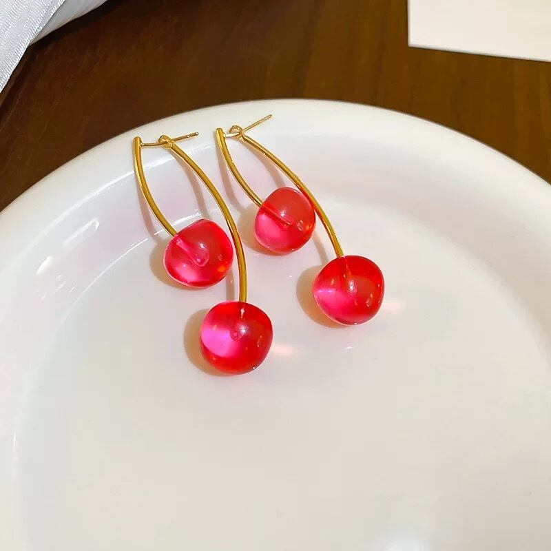 透明感のあるレジン素材で作られたチェリー型デザインピアスは、遊び心と上品さを兼ね備えたアクセサリー。