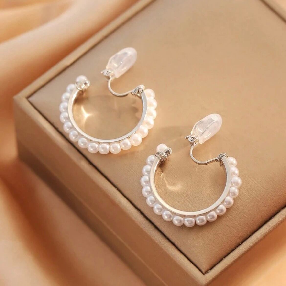 フープ部分には繊細なパールが一列に並び、上品な輝きを放ちます。